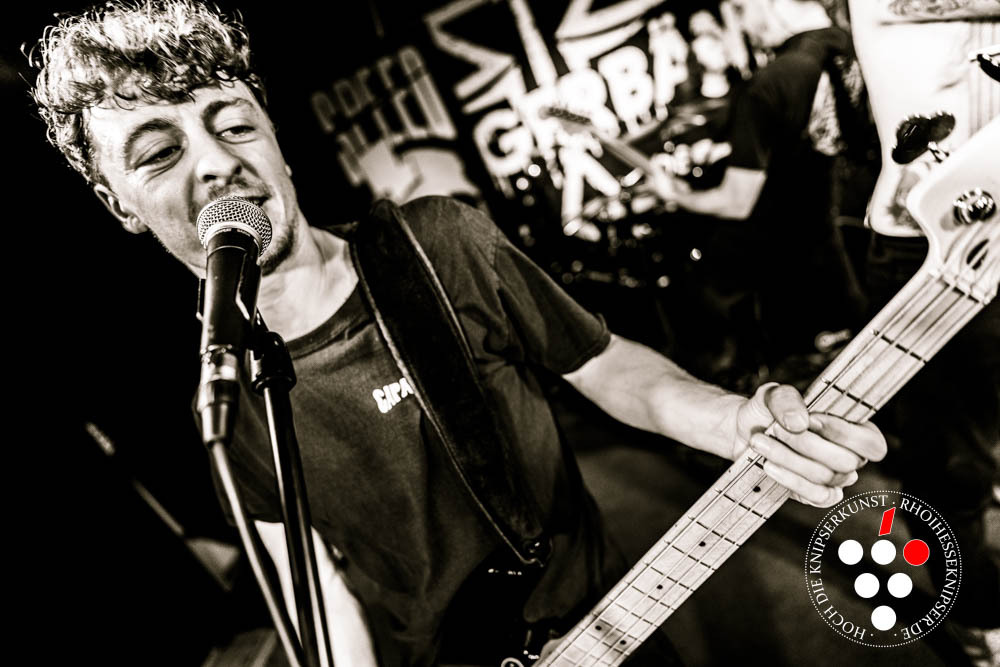 Doch kommen wir zurück zur Hängerbänd: Ende der 1980er Jahre fanden sich in Bingen ein paar Hänger zusammen und stellten fest, dass sie entweder wussten, wo das Kabel bei der Gitarre reinkommt, wie man ein Mikro richtig rumhält oder was man mit diesen komischen Stöcken macht. Möglicherweise hat der Name auch tatsächlich was mit einem Anhänger und einem Auftritt auf demselben zu tun… Fast vierzig Jahre später ist Gitarrist Sprenger Hänger das älteste verbliebene Mitglied – Gitarrist/Bassist Frohny ist vor fünf Jahren verstorben, Sänger Gischtie ist aus gesundheitlichen Gründen zurückgetreten, und am Schlagzeug war eh immer relativ reger Wechsel, – wenn auch Adrian Hänger die Schießbude nun auch schon etliche Jahre sehr kompetent verprügelt. Basser Guido „Holzbein“ Hänger ergänzt die Truppe allerdings auch schon seit gefühlt zwanzig Jahren, und für mich ist dieser Auftritt die Gelegenheit, die Hänger in ihrer neuesten Besetzung endlich einmal live zu sehen…